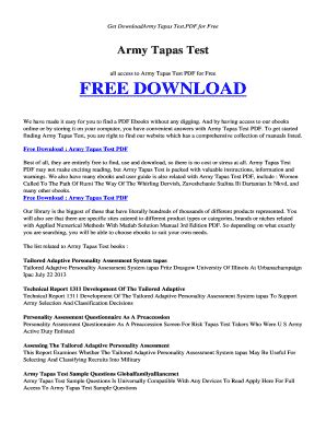 Download army tapas test sample questions Ebook PDF online is a convenient and frugal way to read army tapas test sample questions Ebook you love right from the comfort of your own home. Yes, there sites where you can get PDF "for free" but the ones listed below are clean from viruses and completely legal to use.